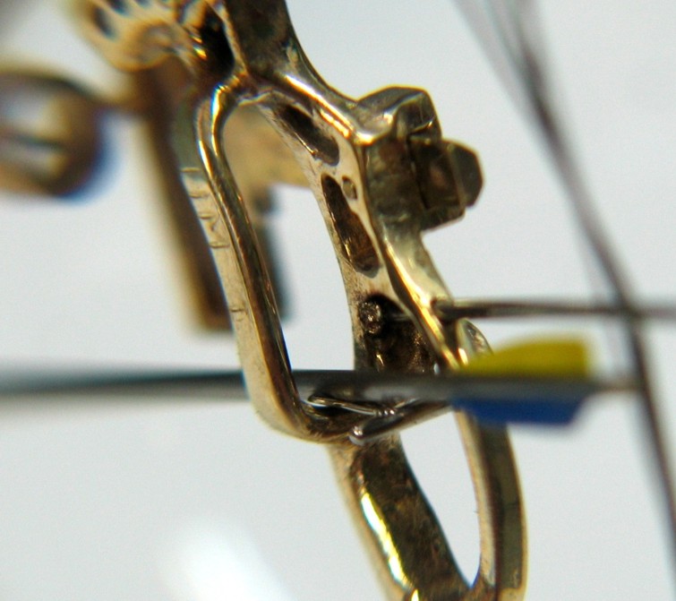 Die Pfeilauflage besteht aus einem 0,2 mm Edelstahldraht, federhart. Es werden 2 kurze Stücke davon V-förmig auf den Träger gelasert,