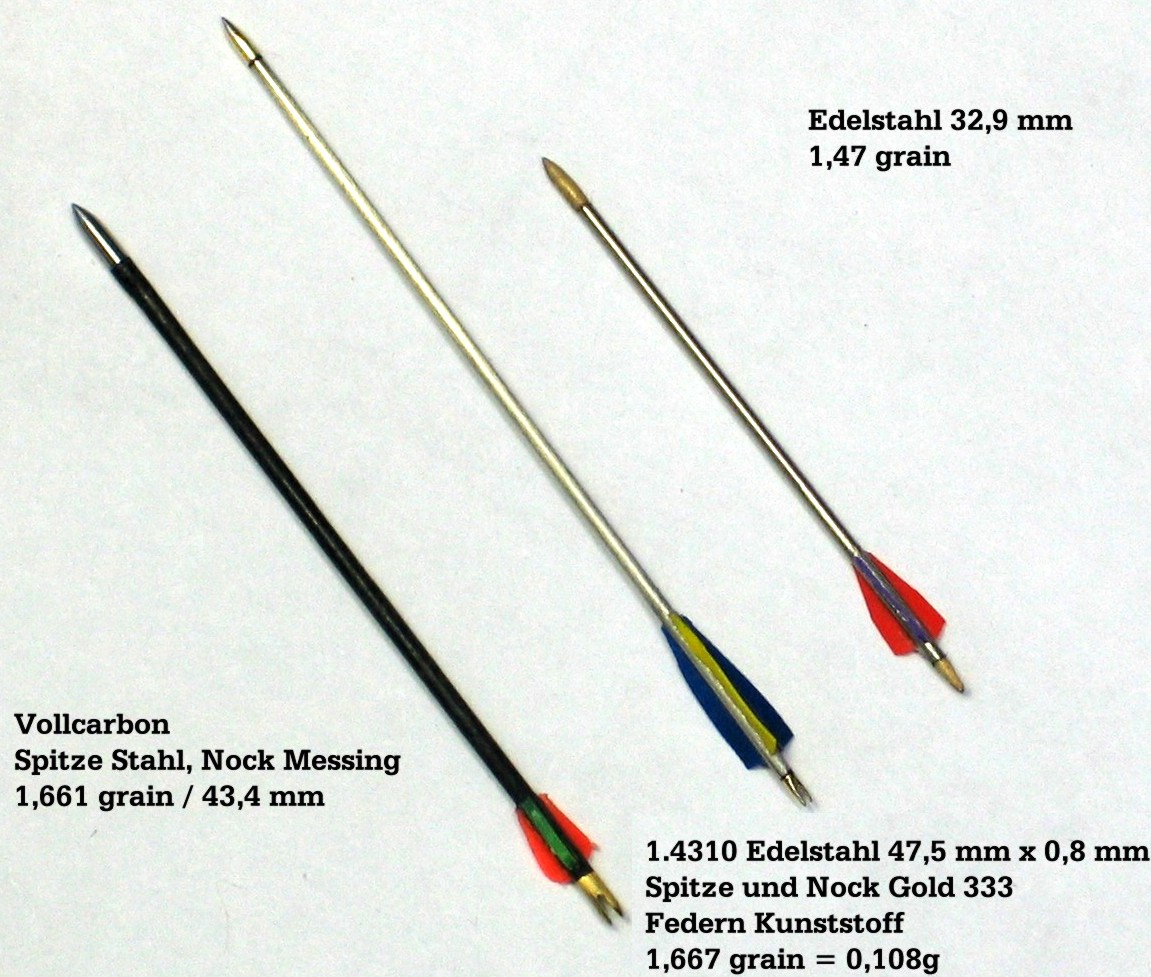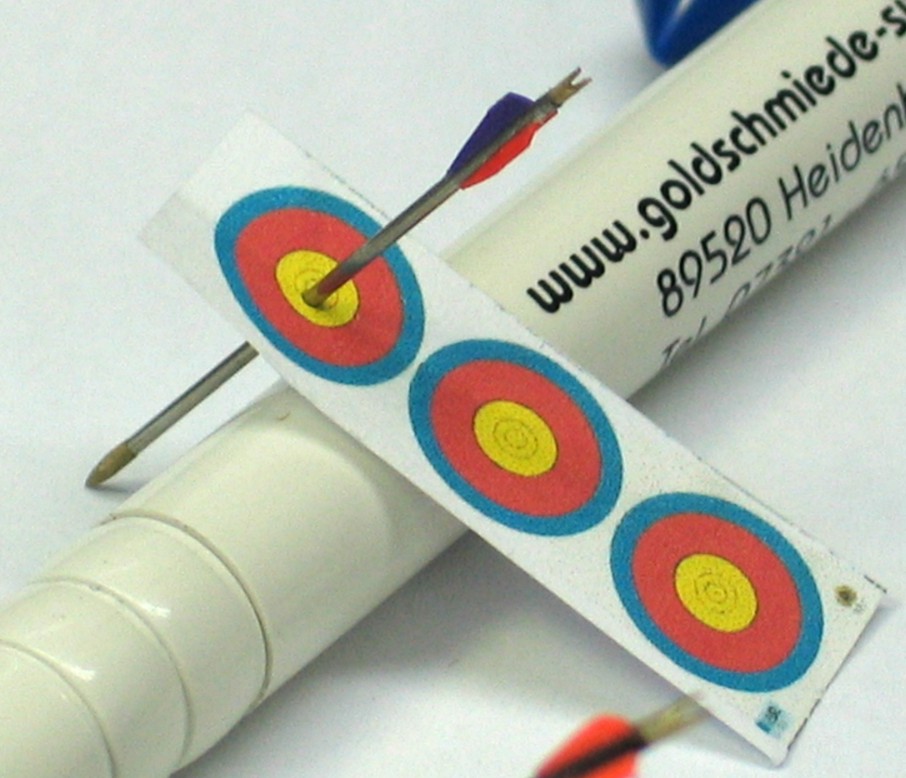 Es empfiehlt sich, bei solchen Probeschüssen dafür Sorge zu tragen, dass eine ausreichend grosse Auffangfläche existiert. Bei Fehlschüssen kam es vor, dass der Pfeil aus kurzer Distanz eine Glass- oder Steinfläche traf. Die Auswirkung für den Pfeil ist ähnlich wie beim grossen Pfeil, die weiche, goldene Spitze und oder der Nock verbiegt sich und wird möglicherweisse unbrauchbar (der Schaft wiederum kann so was gut ab).