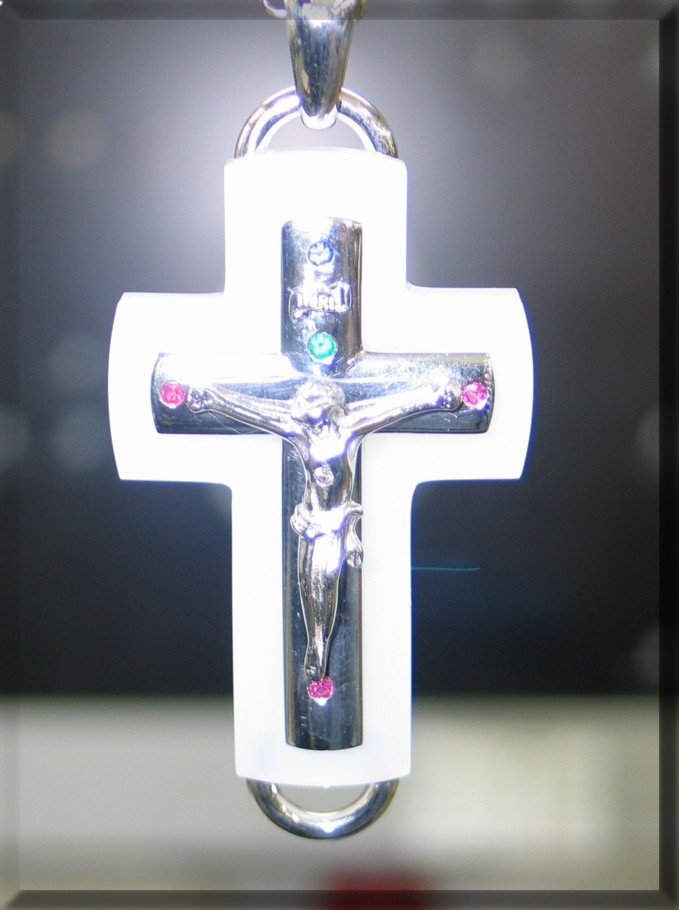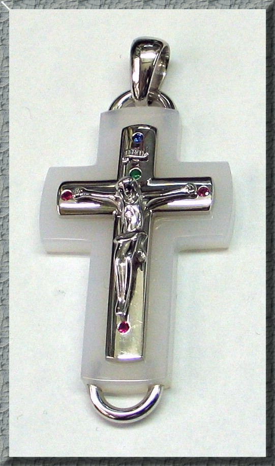 Anhänger Achatkreuz mit Safir, Smaragd, Rubin und Brillant