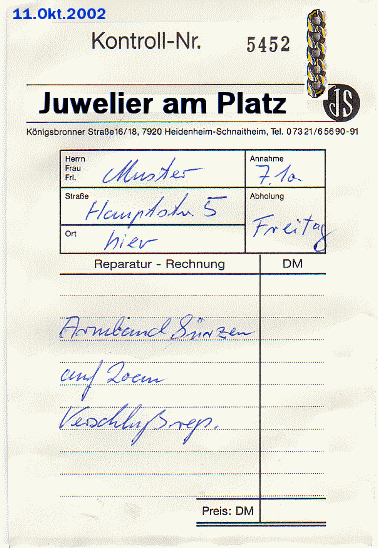 Der Eingang ihrer Sendungen bei uns wird minutiös registriert. Die Gegenstände werden Kopiert und die Kopien an die Reparaturtüte geheftet. Da eine zweite Kopie bei uns im Hause archiviert wird, können wir ihnen bei Rückfragen im Regelfall auch noch Monate später qualifizierte Auskunft geben.